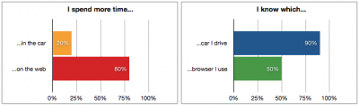 o en español: Gastas mas tiempo en el auto(20%) o en Internet (80%) y luego, ¿Sabes que auto manejas(90%) y sabes que navegador usas (50%)?.